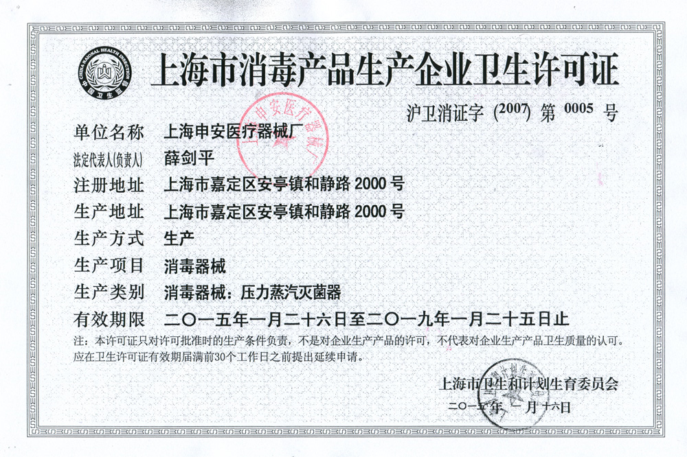 - 上海市消毒產(chǎn)品生產(chǎn)企業(yè)衛(wèi)生許可證【滬衛(wèi)消證字(2007)第0005號】