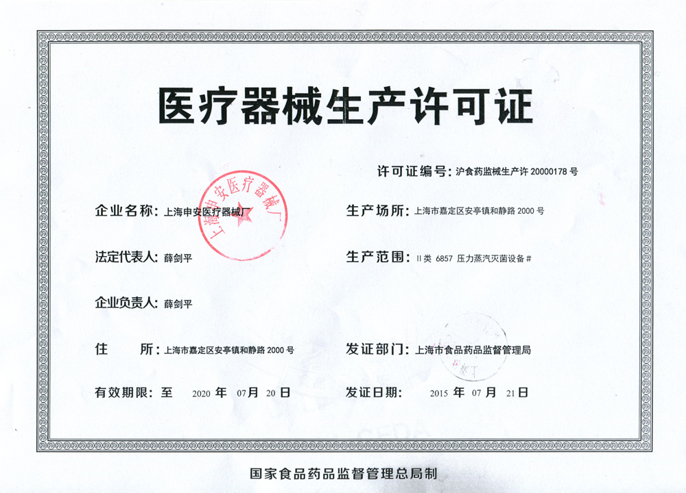 - 醫(yī)療器械生產(chǎn)許可證【滬食藥監(jiān)械生產(chǎn)許20000178號】
