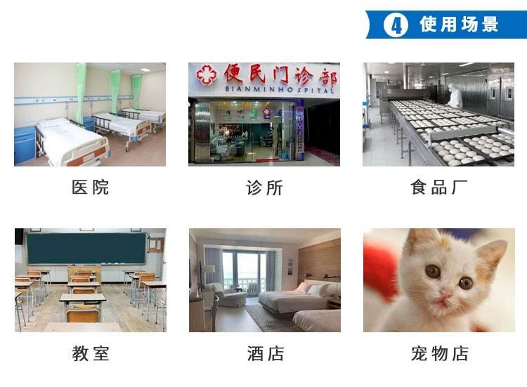 用于醫療機構(手術室、治療室、供應室、制劑室、病房)、需要消毒的公共場所、學校、有衛生要求的生產車間、家庭居室等,進行室內空氣消毒